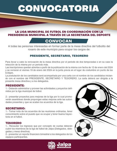 ⚽️⚾️✅️La Secretaría del Deporte te invita a consultar las siguientes convocatorias. #UnaNuevaHistoria 16 enero, 202416 enero, 2024efrain La Secretaría del Deporte te invita a consultar las siguientes convocatorias. #UnaNuevaHistoria TAMBIÉN TE PUEDE INTERESAR XXVIII Semana Cultural en #JalpitaLaBella