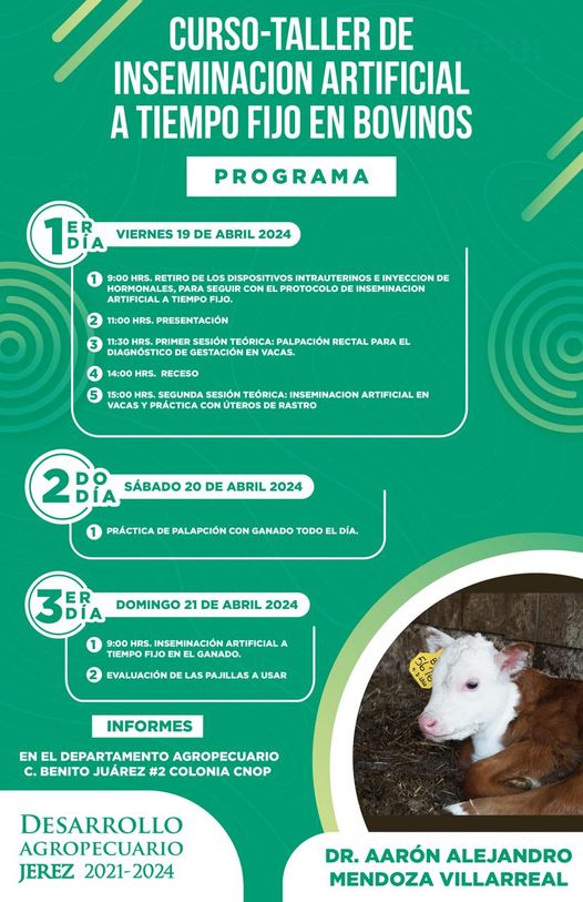 🐂🐄 Curso-Taller de Inseminación Artificial a Tiempo Fijo para Bovinos 11 abril, 202411 abril, 2024efrain Del viernes 19 al domingo 21 de abril Informes en el Departamento Agropecuario TAMBIÉN TE PUEDE INTERESAR ¡Arrancamos con todo!
