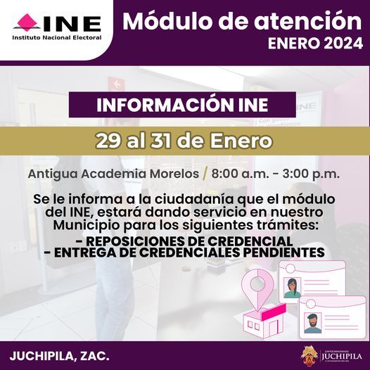 Del 29 al 31 de enero, ac茅rcate a las instalaciones del m贸dulo de atenci贸n del INE (Antigua Academia Morelos) para la realizaci贸n de los siguientes tr谩mites: reposici贸n de credencial y entrega de credenciales pendientes, en un horario de 8:00 a.m. a 3:00 p.m.