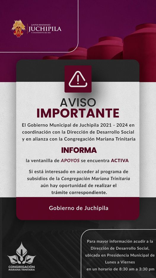 El Gobierno Municipal de Juchipila 2021 – 2024 en coordinaciΓ³n con la DirecciΓ³n de Desarrollo Social y en alianza con la CongregaciΓ³n Mariana Trinitaria ππ‘ππ’π₯π π: la ventanilla de: ππ£π’π¬π’π¦ se encuentra πππ§ππ©π.