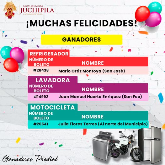 Te anexamos los ganadores del estรญmulo por pago pronto del Predial realizada el dรญa de hoy en una transmisiรณn en vivo.