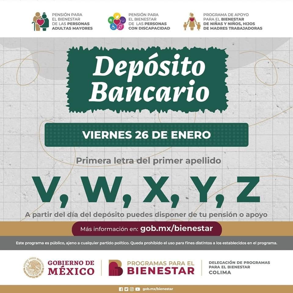 #RecuerdaQue Hoy viernes 26 de enero reciben su apoyo los beneficiarios de #PensiónAdultoMayor, #PensiónDiscapacidad y #MadresTrabajadoras, cuyo primer apellido inicia con las letras V, W, X, Y, Z.No olvides que puedes consultar tu saldo sin salir de casa en la aplicación del #BancoDelBienestar o llamando al 📞 800 900 2000.
