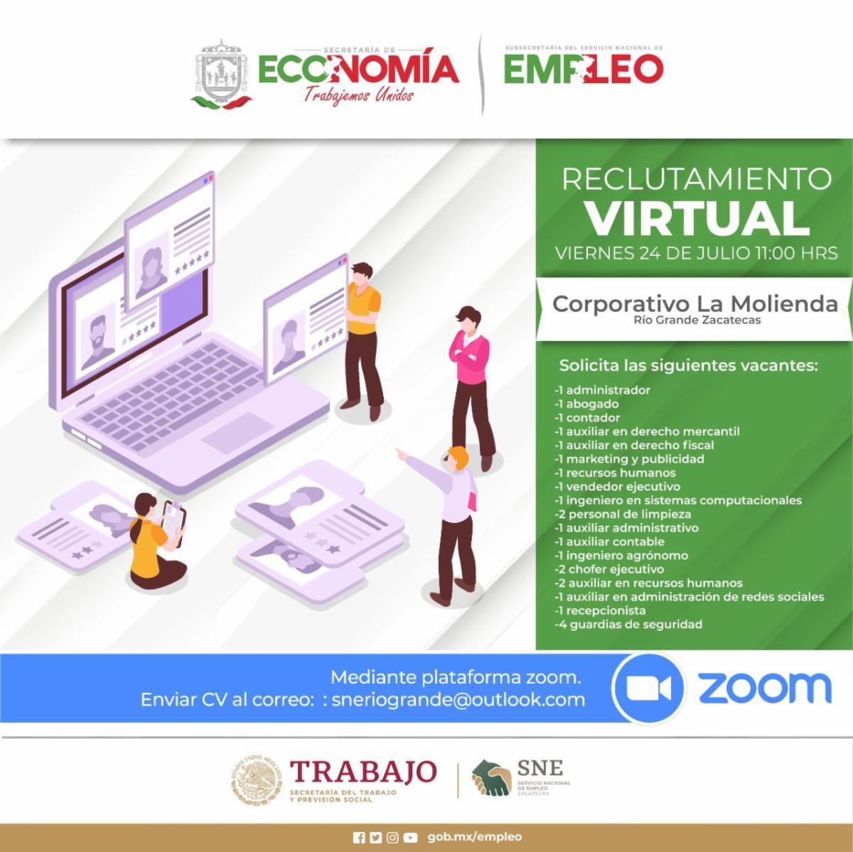 Río Grande, Zac.- El Servicio Nacional del Empleo (SNE) Zacatecas invita a la población que busca un espacio laboral a que participe en la 17 Jornada de Reclutamiento Virtual dirigida a operarios, técnicos y profesionistas del municipio Río Grande y la región, la cual se realizará este viernes 24 de julio, a las 11:00 horas.