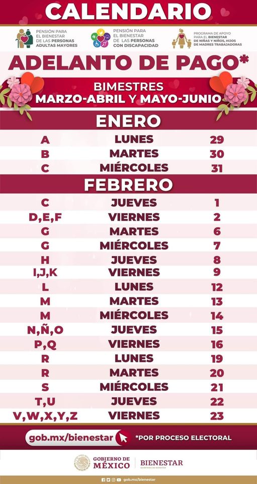 Del 29 de enero al 23 de febrero, se realizará debido al proceso electoral, el adelanto del depósito de los bimestres: MARZO-ABRIL, MAYO-JUNIO de las #PensionesBienestar y del programa de #MadresTrabajadoras.