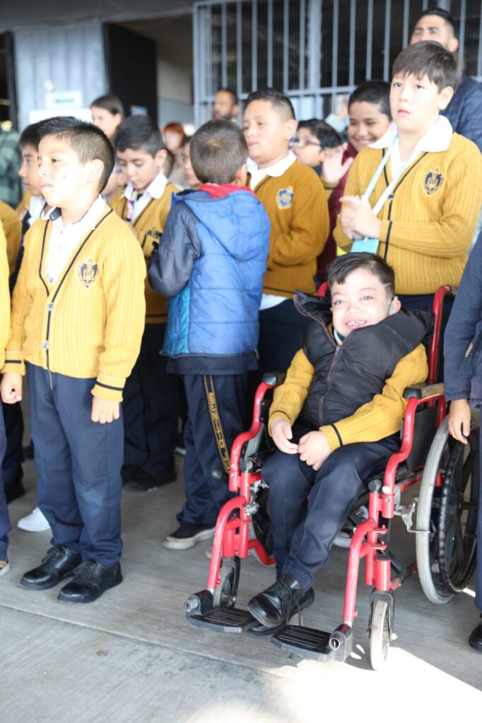 Sus amigos de aula son quienes lo apoyan para que él aprenda; unos le ayudan a sacar los útiles de la mochila, otros empujan su silla de ruedas para que salga a recreo o vaya al baño. Gracias a los docentes, el ambiente escolar en las aulas permite el aprendizaje de conocimientos y valores.