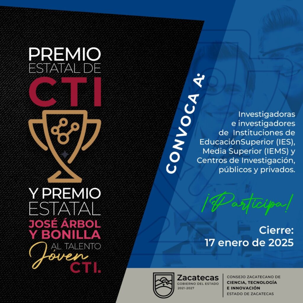 Zacatecas, Zac., 7 de enero de 2025.- El Gobierno de Zacatecas, encabezado por el mandatario estatal David Monreal Ávila, amplió el periodo para recibir las postulaciones al Premio Estatal de Ciencia, Tecnología e Innovación, así como al Premio Estatal “José Árbol y Bonilla” al Talento Joven Científico, Tecnológico o de Innovación 2024.