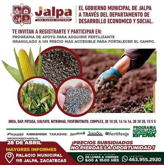 apoyo para adquirir fertilizante 25 abril, 202325 abril, 2023efrain El Gobierno Municipal de Jalpa te invita a registrarte y participar en el programa de apoyo para adquirir fertilizante. TAMBIÉN TE PUEDE INTERESAR EN COMPAÑÍA DE REGIDORES, EL ALCALDE EDGAR VIRAMONTES SUPERVISA LA CONSTRUCCIÓN DE AULAS EN LA UAZ CAMPUS JALPA.