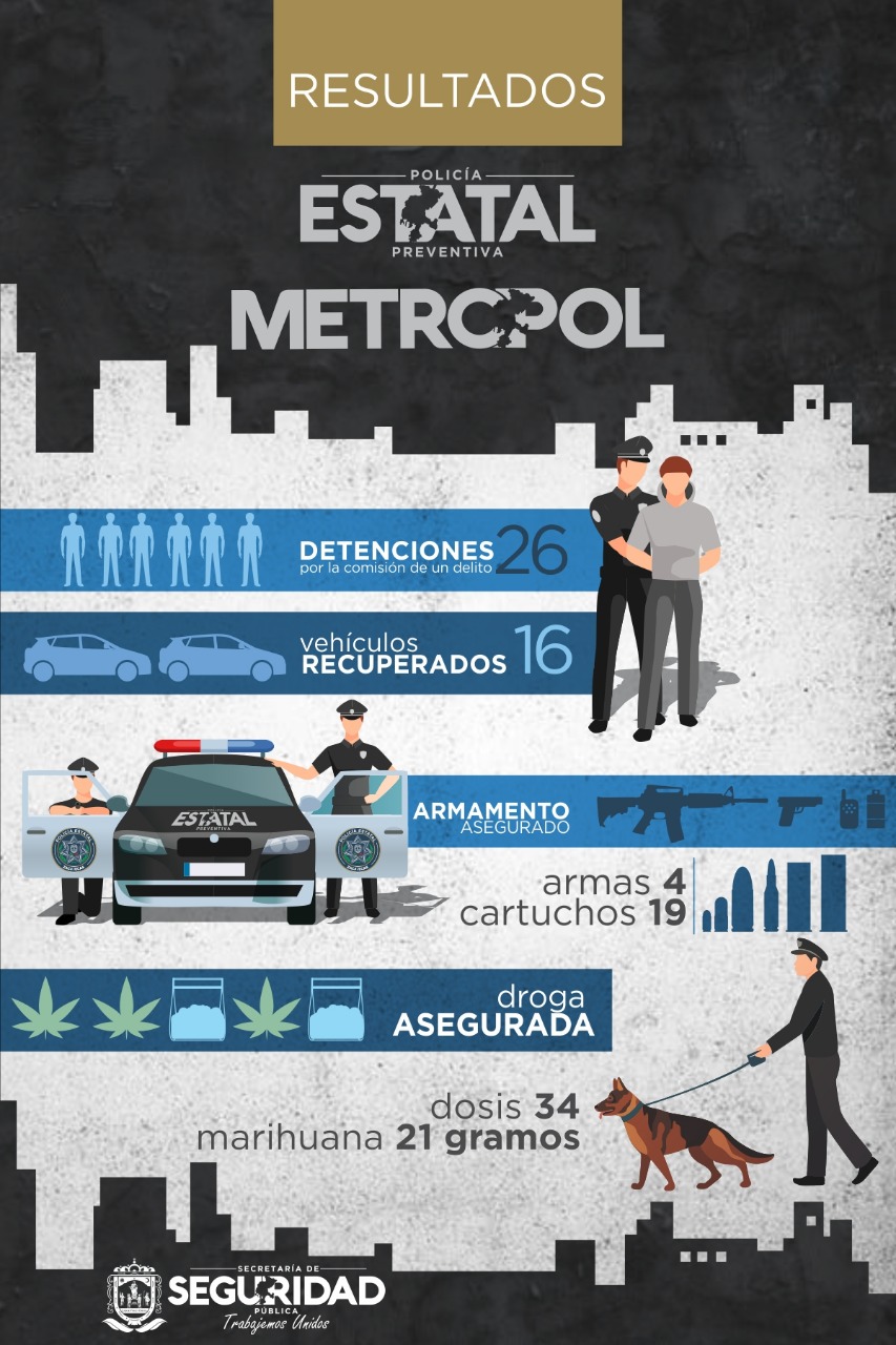 Durante la reunión del Grupo de Coordinación Local (GCL), la Fiscalía General de Justicia del Estado (FGJE) informó los resultados de diversas acciones en las que participaron corporaciones de diferentes municipios, la Policía de Investigación, la Policía Estatal Preventiva (PEP), la Policía Metropolitana (Metropol), la Guardia Nacional y el Ejército Mexicano Elementos de la PEP y la Metropol detuvieron a 26 personas por la probable comisión de delitos del fuero común y del federal; aseguraron 16 vehículos con reporte de robo y por participar en hechos ilícitos; decomisaron cuatro armas de fuego, 19 cartuchos, 34 dosis y 21 gramos de sustancias ilícitas.