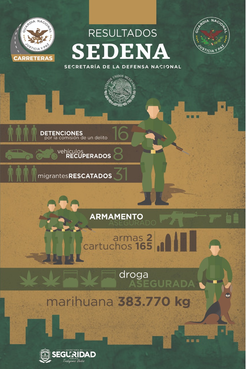 La Dirección General de Seguridad en Carreteras e Instalaciones, de la Guardia Nacional, detuvo a tres personas, aseguró tres vehículos, un arma corta, 100 cartuchos de 9 milímetros y 50 cartuchos de calibre 40. En tanto, integrantes de la Guardia Nacional detuvieron a 11 personas, aseguraron cinco vehículos, un arma de fuego y 15 cartuchos útiles.