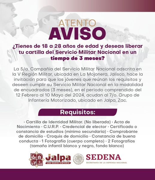 ¡Atento Aviso! 20 enero, 202420 enero, 2024efrain Consulta los requisitos para liberar tu Cartilla del Servicio Militar Nacional en un tiempo de 3 meses. TAMBIÉN TE PUEDE INTERESAR LA REINA DE LA FERIA REGIONAL JALPA, KATY I Y LA REINA DE LA FERIA DE LA PITAYA 2019, DANIELA I ENTREGAN DESPENSAS EN JALPA.