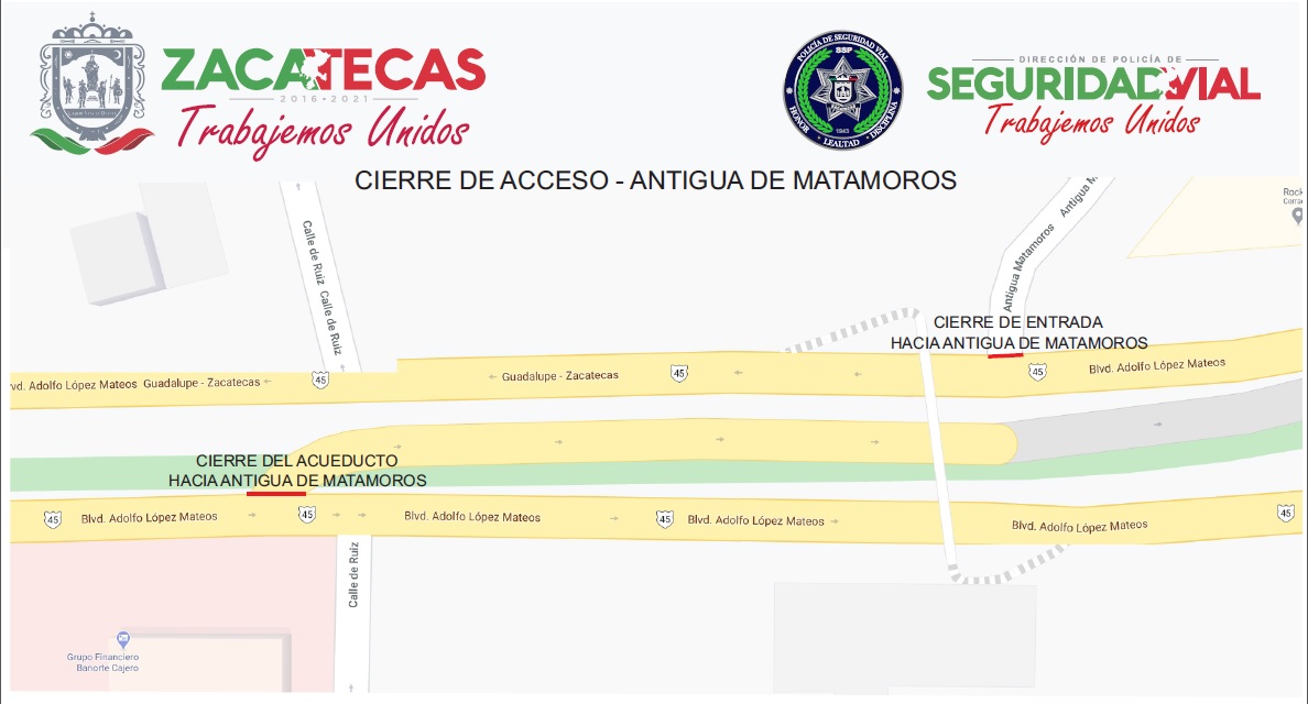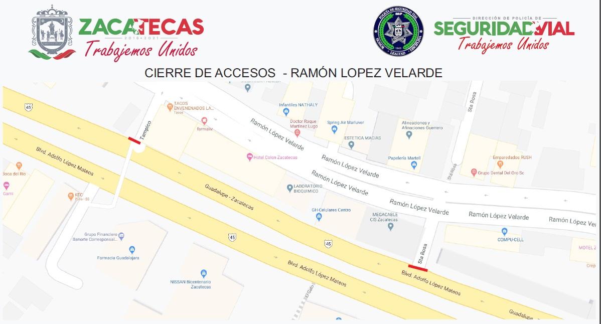Zacatecas, Zac.- A partir de este viernes 24 de abril, autoridades de la Dirección de Policía de Seguridad Vial (DPSV) cerrarán los accesos a la avenida Ramón López Velarde y a la antigua Matamoros, en reforzamiento a los cierres ya existentes en vialidades del estado, informó Francisco Oswaldo Caldera Murillo, titular de la dependencia.