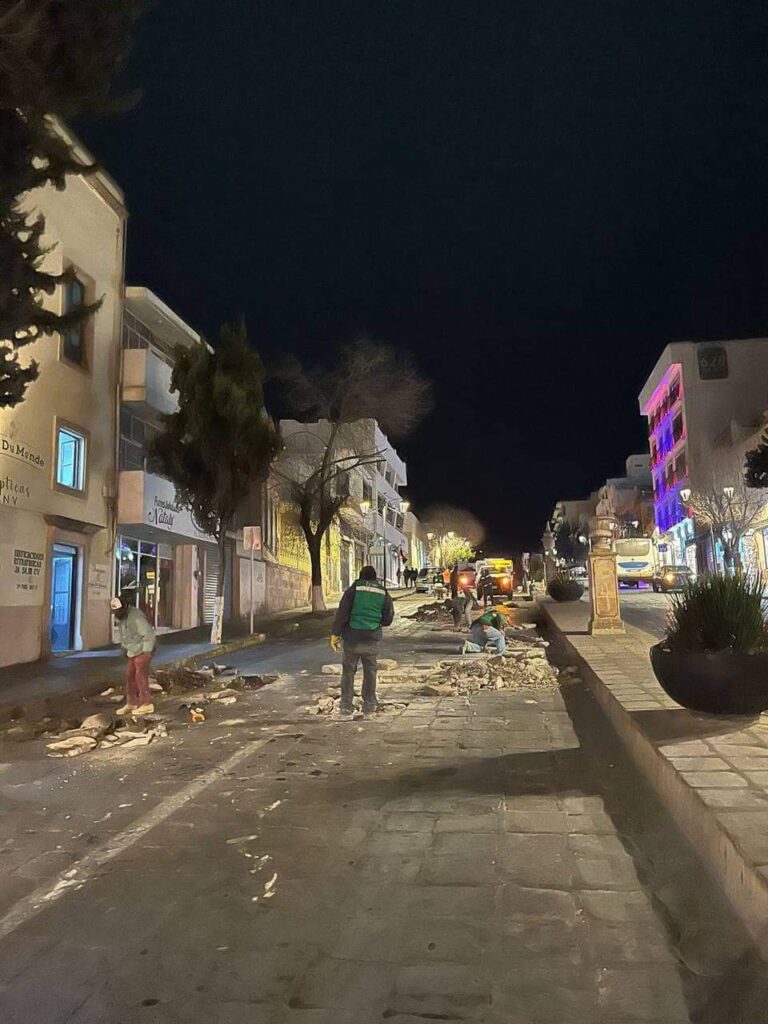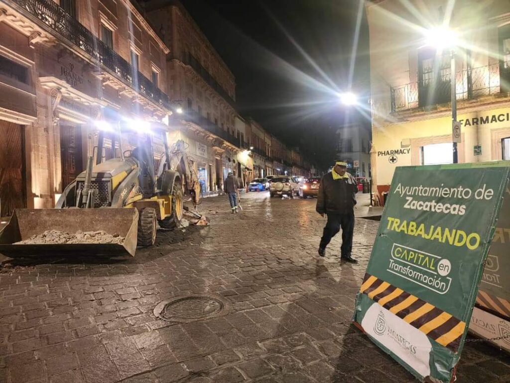 Zacatecas, Zac. El Ayuntamiento de Zacatecas, a través de la Secretaría de Servicios Públicos, realiza jornadas nocturnas de bacheo en el primer cuadro del Centro Histórico, manteniendo en condiciones óptimas a todas las calles de la ciudad.