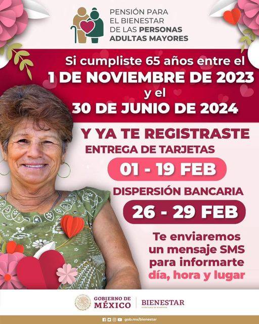 Si cumpliste 65 años o más entre el 1 de noviembre de 2023 y el 30 de junio de 2024 y te registraste a la #PensiónAdultoMayor, te tenemos #BuenasNoticias. Del 1 al 19 de FEBRERO te entregaremos tu #TarjetaBienestar. Mantente atento a tu celular, te enviaremos un SMS con los datos para recogerla.#RecuerdaQue para este caso la dispersión bancaria será del 26 al 29 de FEBRERO. #PrimeroLosPobres