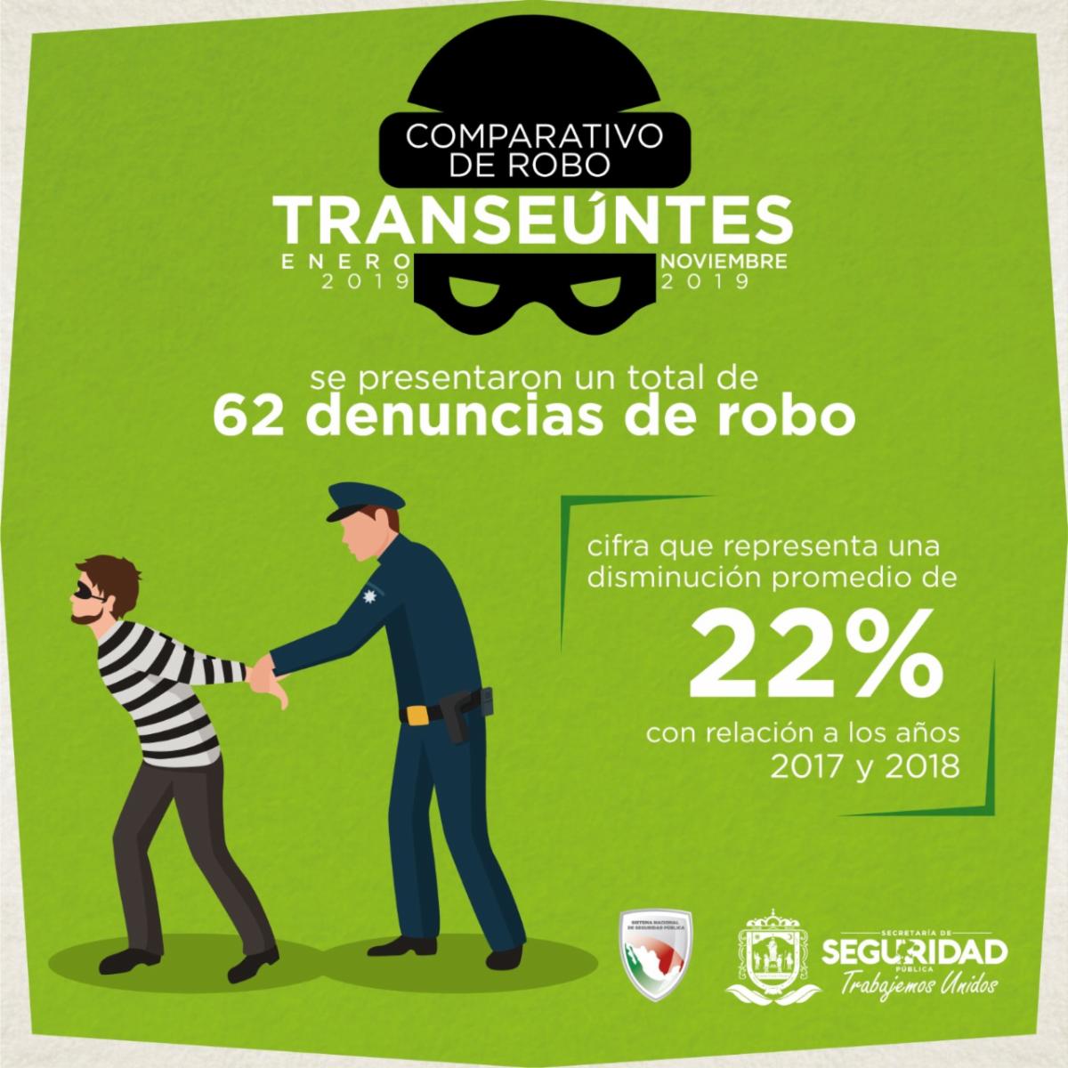 Mientras en el decremento con relación al 2018 fue de 15.1 por ciento, ya que de enero a noviembre de ese año denunciaron 73 casos. La publicación de resultados más recientes del organismo nacional, que contabiliza los delitos cometidos de enero a noviembre de 2019, refiere que la incidencia de robo a transeúnte se concentra en los municipios de Guadalupe, Fresnillo y Zacatecas.