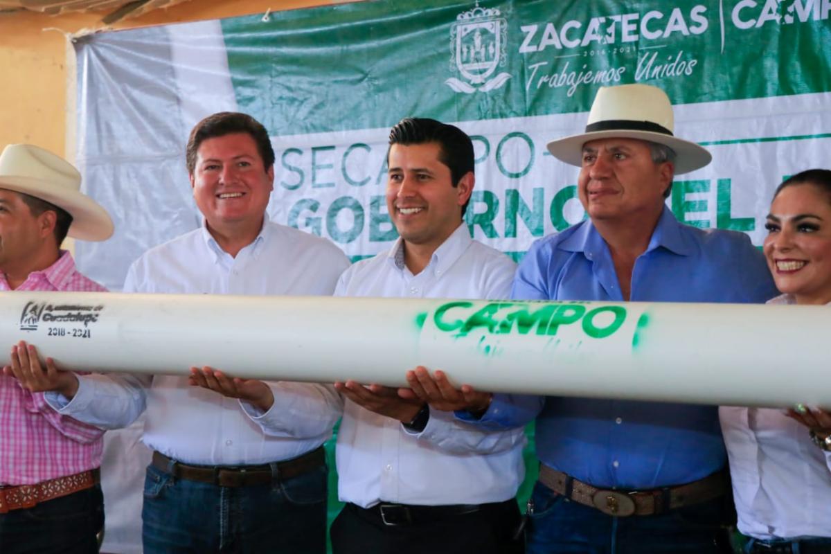 Finalmente, en la comunidad de El Bordo, con el alcalde de Guadalupe, Julio César Chávez, el Secretario del Campo hizo entrega de tubería para líneas de conducción, paquetes de ovinos, caprinos y aves, con una inversión de cuatro millones de pesos, para beneficio de 141 productores.