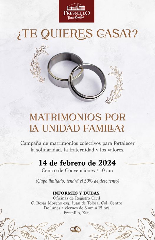 BODAS COLECTIVAS 25 enero, 202425 enero, 2024efrain Celebremos al amor brindando certeza jurídica a su relación con la unión al civil en la campaña de #BodasColectivas TAMBIÉN TE PUEDE INTERESAR Tiene Zacatecas todo para instalar el primer centro espacial análogo de México: Lorena Rojas