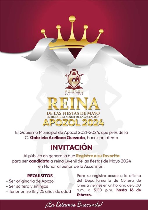 REGISTRA A TU CANDIDATA A REINA JUVENIL DE LAS FIESTAS DE APOZOL 2024Tienes hasta el 16 de febrero para realizar el registro.