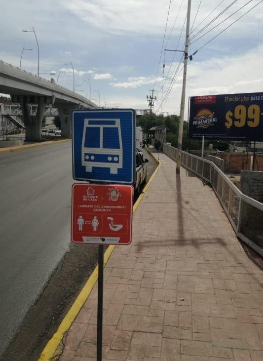 Zacatecas, Zac.- Para reforzar las acciones de sana distancia, la Dirección de Policía de Seguridad Vial (DPSV) inició la colocación de señalética en los diversos paraderos de rutas de transporte público del circuito de Ciudad Administrativa a la colonia Tres Cruces.