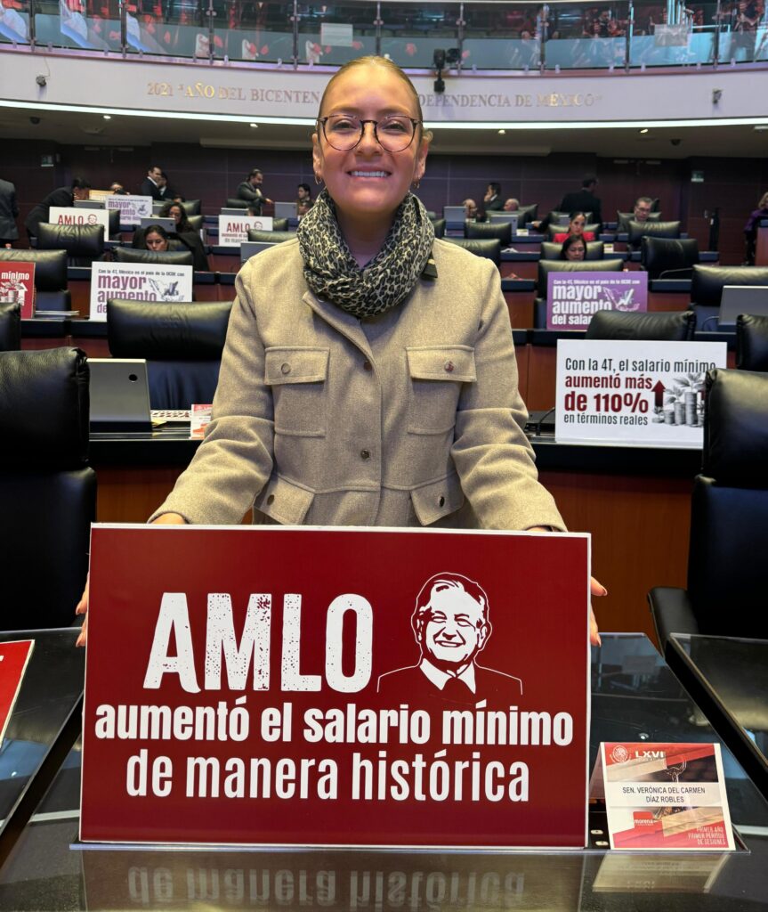 La legisladora zacatecana recordó que durante la administración del presidente Andrés Manuel López Obrador, el gobierno de México estableció una nueva política de aumentos al salario mínimo, lo que ha significado un crecimiento del 110 por ciento en términos reales, pasando de 88.36 pesos diarios que recibía la base trabajadora en 2018 a 248.93 pesos diarios en 2024.