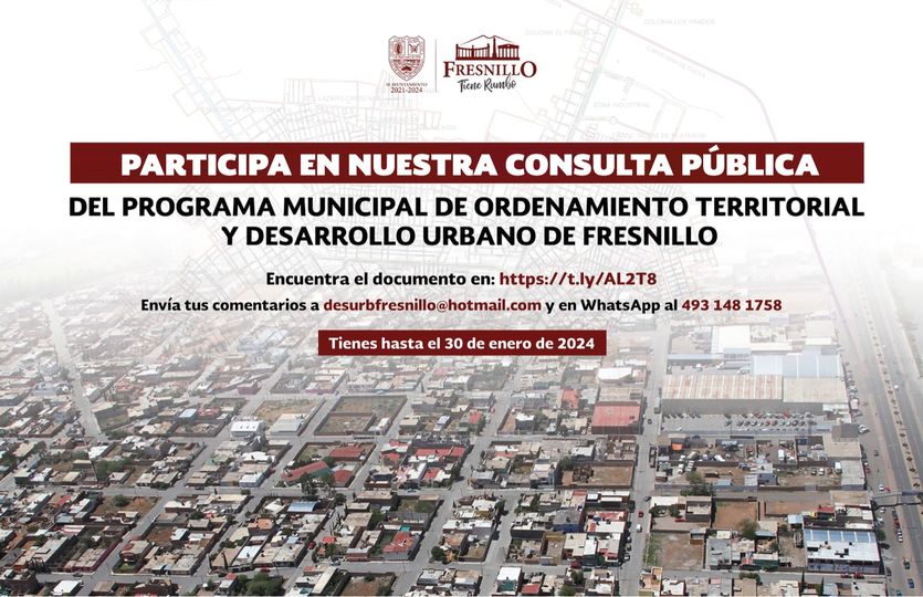 Esta consulta está abierta del lunes 22 al martes 30 de enero. El correo de recepción de comentarios es desurbfresnillo@hotmail.com o, mediante WhatsApp, al 493 148 1758.#FresnilloSomosTodos