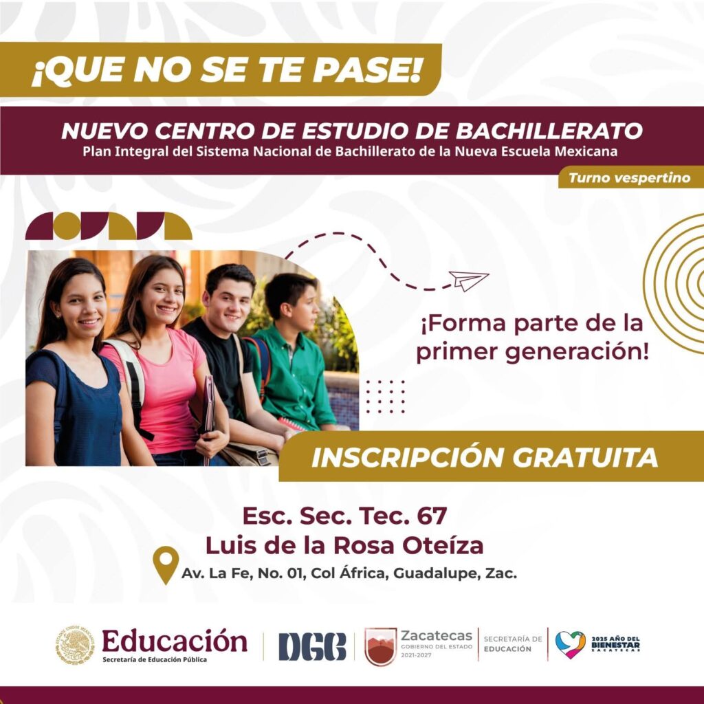 Zacatecas, Zac., 6 de agosto de 2025.- Continúa abierta la convocatoria para inscribirse, en el ciclo escolar 2025-2026, en el nuevo plantel de educación media superior, que estará bajo el subsistema de la Dirección General de Bachillerato (DGB), y que se instalará en Guadalupe.