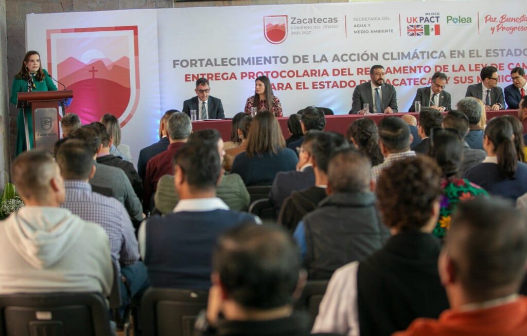 Zacatecas, Zac., 09 de noviembre de 2023.- Con un reconocimiento a Zacatecas por su liderazgo en materia de medio ambiente, el Gobierno encabezado por David Monreal Ávila recibió del Programa México-UK PACT (Partnering for Accelerated Climate Transitions) y la organización Política y Legislación Ambiental (POLEA), el reglamento de la Ley de Cambio Climático para el Estado de Zacatecas y sus Municipios, un instrumento jurídico que establece metas concretas para hacer frente a la crisis climática mundial.