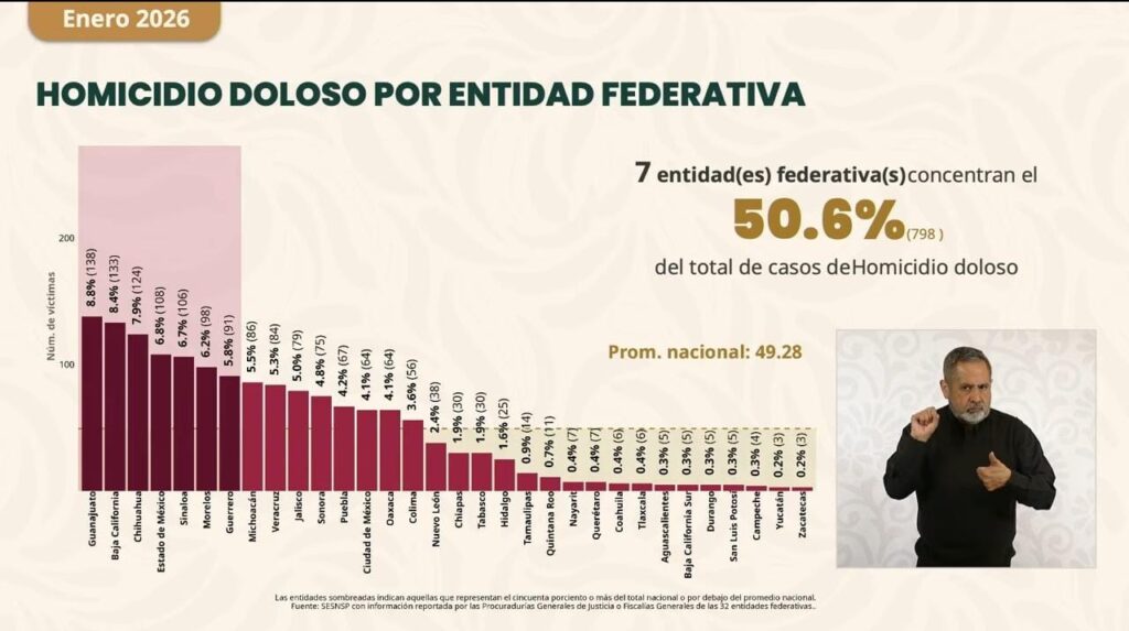 En el mismo informe se destaca que, a nivel nacional, siete entidades concentran el 50.6 por ciento del total de homicidios dolosos: Guanajuato, Baja California, Chihuahua, Estado de México, Sinaloa, Morelos y Guerrero. El promedio nacional de homicidios dolosos fue de 49.28 en el mes de enero.