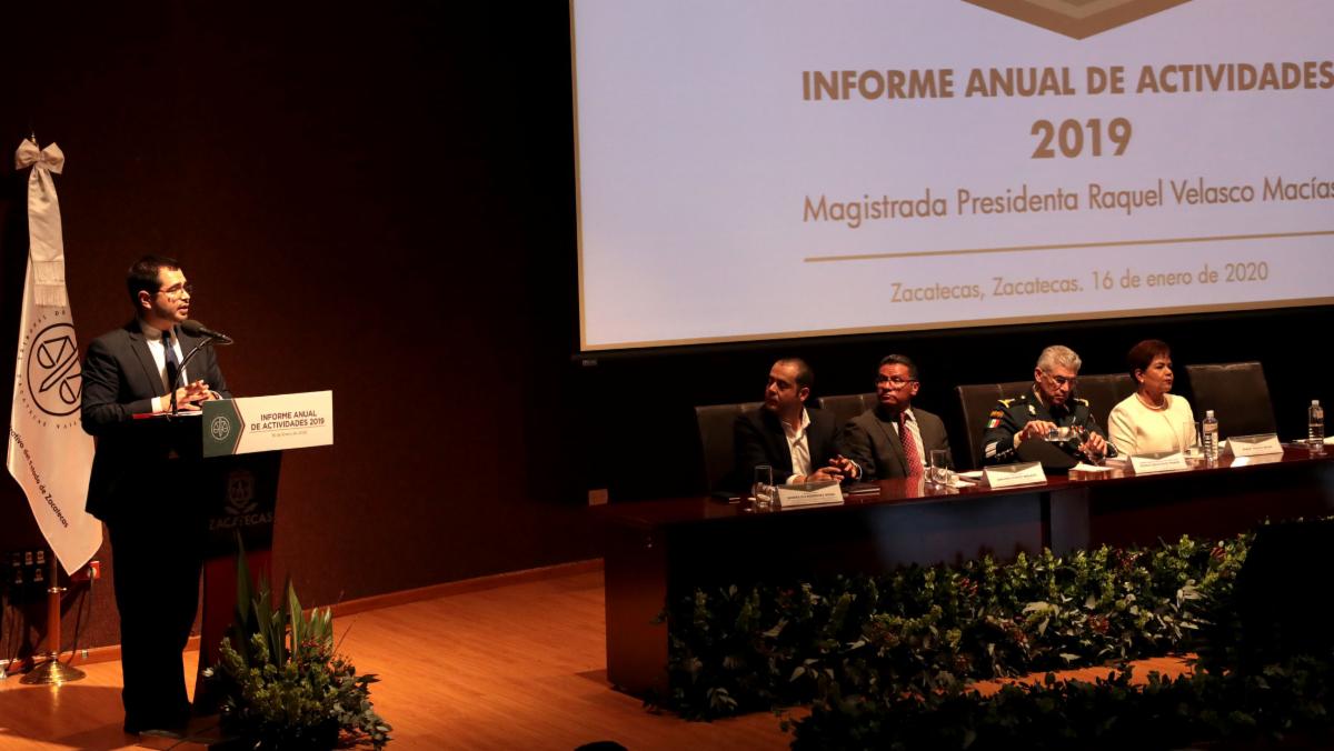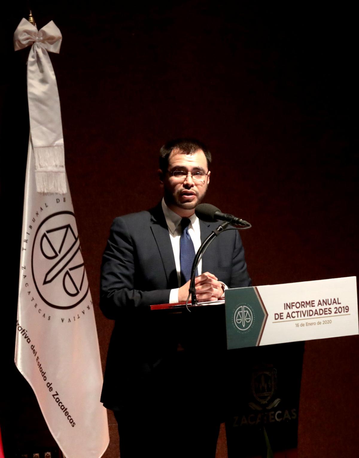 Zacatecas, Zac.- Al asistir al informe anual de actividades del Tribunal de Justicia Administrativa, el Secretario General de Gobierno, Jehú Eduí Salas Dávila, destacó el compromiso de la administración de Alejandro Tello de propiciar una justicia pronta, de calidad e impecable.