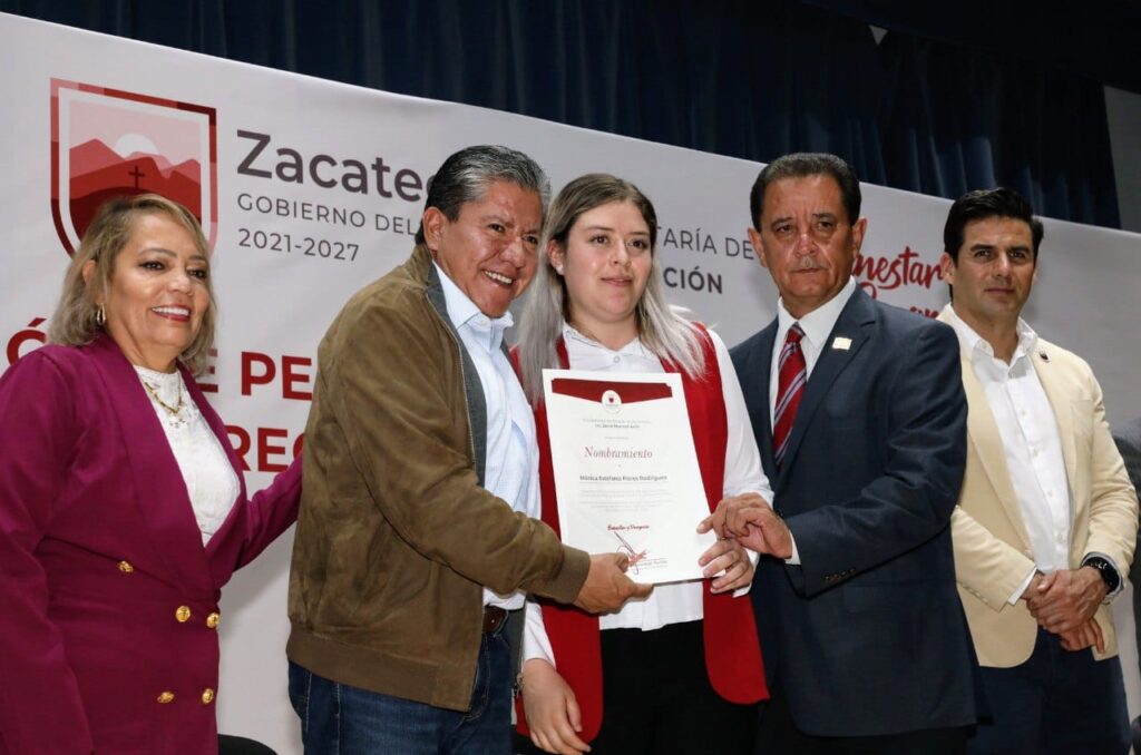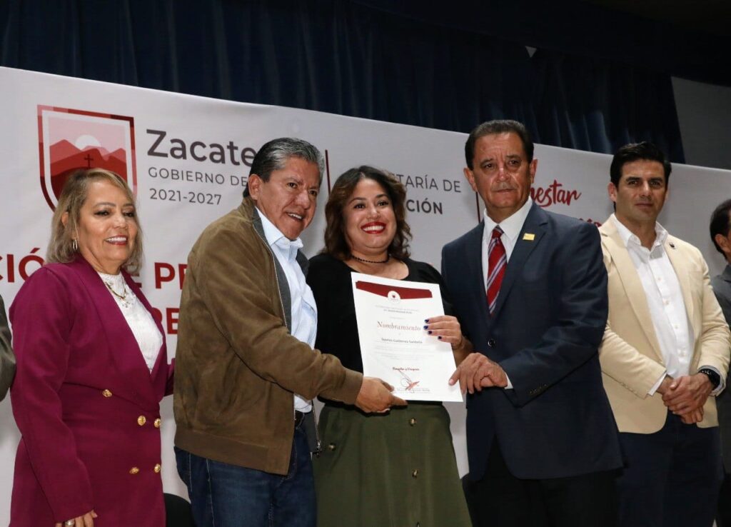 Esta tarde, intendentes, auxiliares administrativos, trabajadores sociales, prefectos y taquimecanógrafos de escuelas ubicadas de Zacatecas recibieron de manos del mandatario su nombramiento de base o su recategorización, los cuales, se destacó, se otorgaron con base en criterios transparentes y tomando en cuenta la antigüedad y desempeño de las y los beneficiarios.