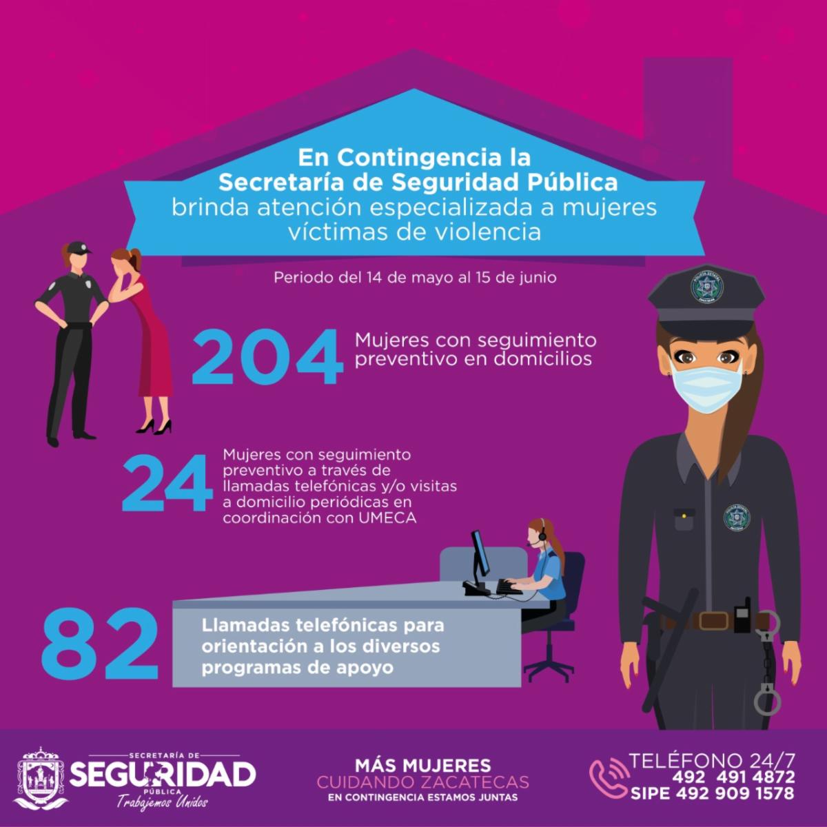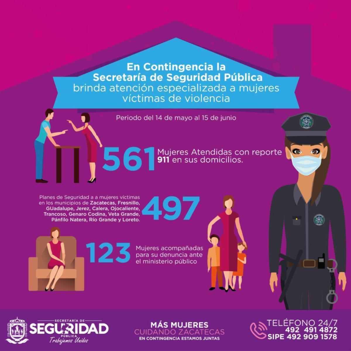 Zacatecas, Zac.- Como resultado de mecanismos de prevención y atención de escenarios de riesgo que violenten la integridad física y emocional de las zacatecanas, durante el periodo 14 de mayo-15 de junio, la Secretaría de Seguridad Pública (SSP) brindó, a través de unidades especializadas, 1 mil 491 servicios de atención a niñas y mujeres.