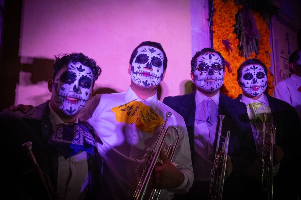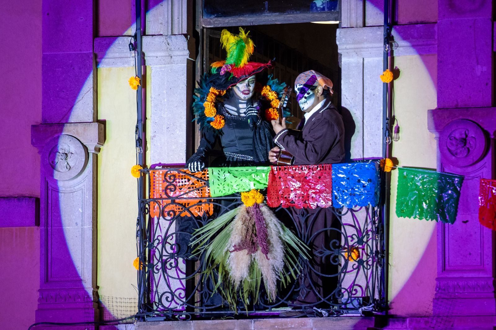 En un gesto de cercanía, esqueletos de gran tamaño se asoman por los balcones de las casonas antiguas y saludan a la gente; la Catrina sonriente, rodeada de flores de papel brillante, parece haber regresado un rato a su antiguo hogar.