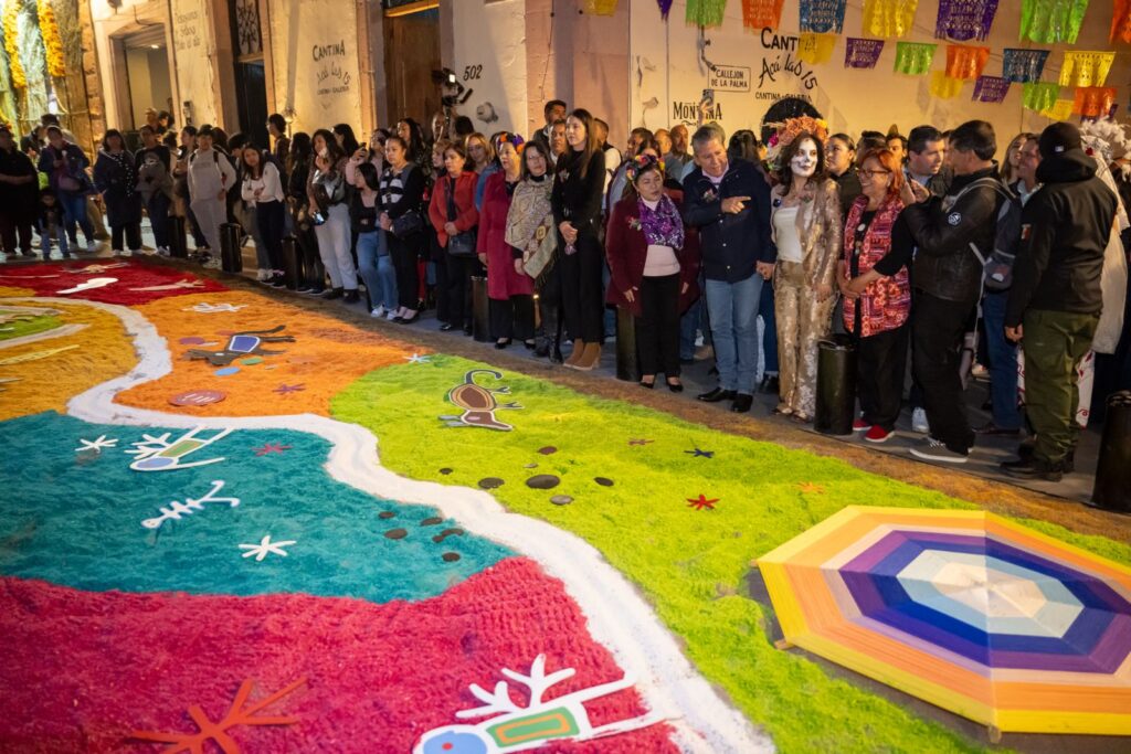 En el recorrido, se toparon con la figura del Cráneo Prehispánico con su penacho de plumas, y la Cruz de Cempasúchil. En el Teatro Calderón, se hizo un homenaje a los artistas zacatecanos Pedro y Rafael Coronel, Amparo Dávila y Fernando Calderón.