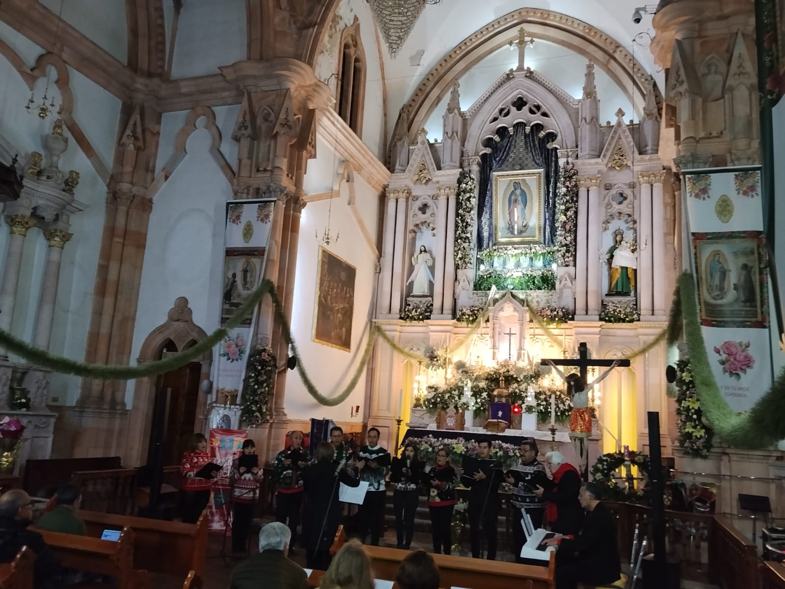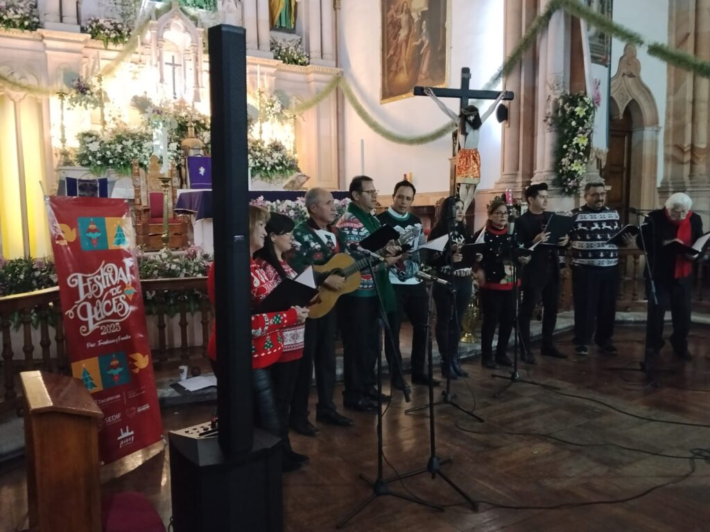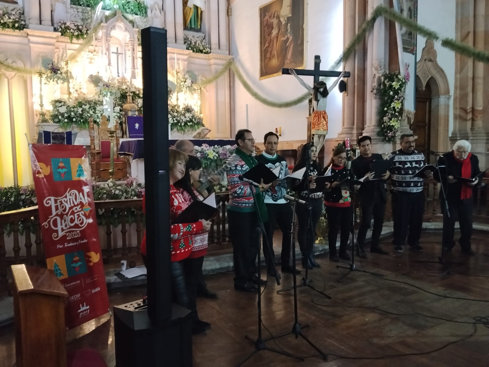 Zacatecas, Zac., 19 de diciembre de 2025.- Como parte del programa del Festival de Luces 2025, organizado por el Gobierno del Estado, a través del Instituto Zacatecano de Cultura (IZC), el Ensamble Voces del Alma ofreció un emotivo Concierto de Navidad, en el Templo de Nuestra Señora de Guadalupito, con un repertorio que celebró la esperanza, la espiritualidad y la fraternidad, propias de esta época.