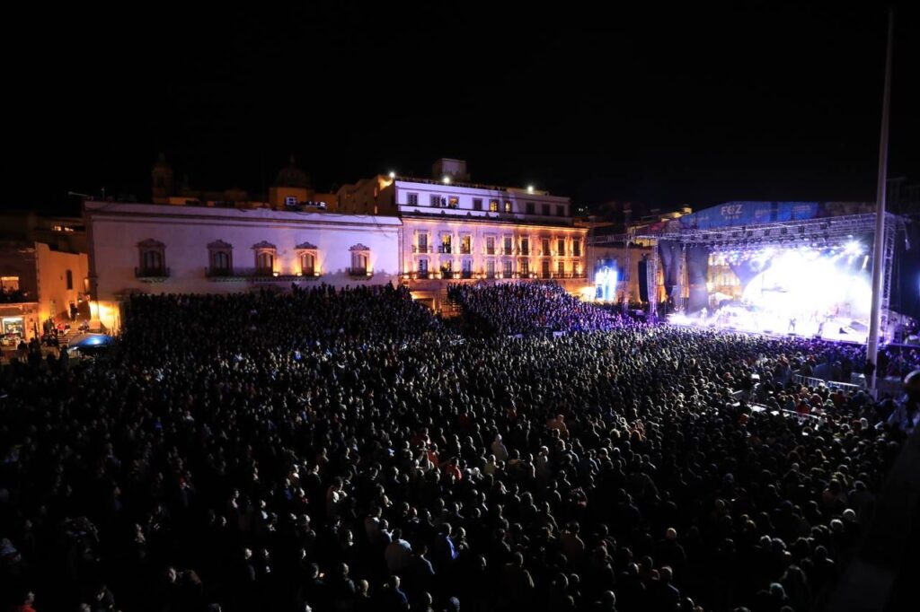 Zacatecas, Zac., 11 de abril de 2023.- Con ritmos y temas de décadas pasadas, notas de júbilo con saxofón, percusiones y extraordinarias voces de dos icónicas agrupaciones La Sonora Santanera y La Maldita Vecindad fueron los elementos perfectos para convertir a la Plaza de Armas, foro principal del Festival Cultural de los zacatecanos, en una gran pista de baile, con la estelar actuación de La Vecindad Santanera.
