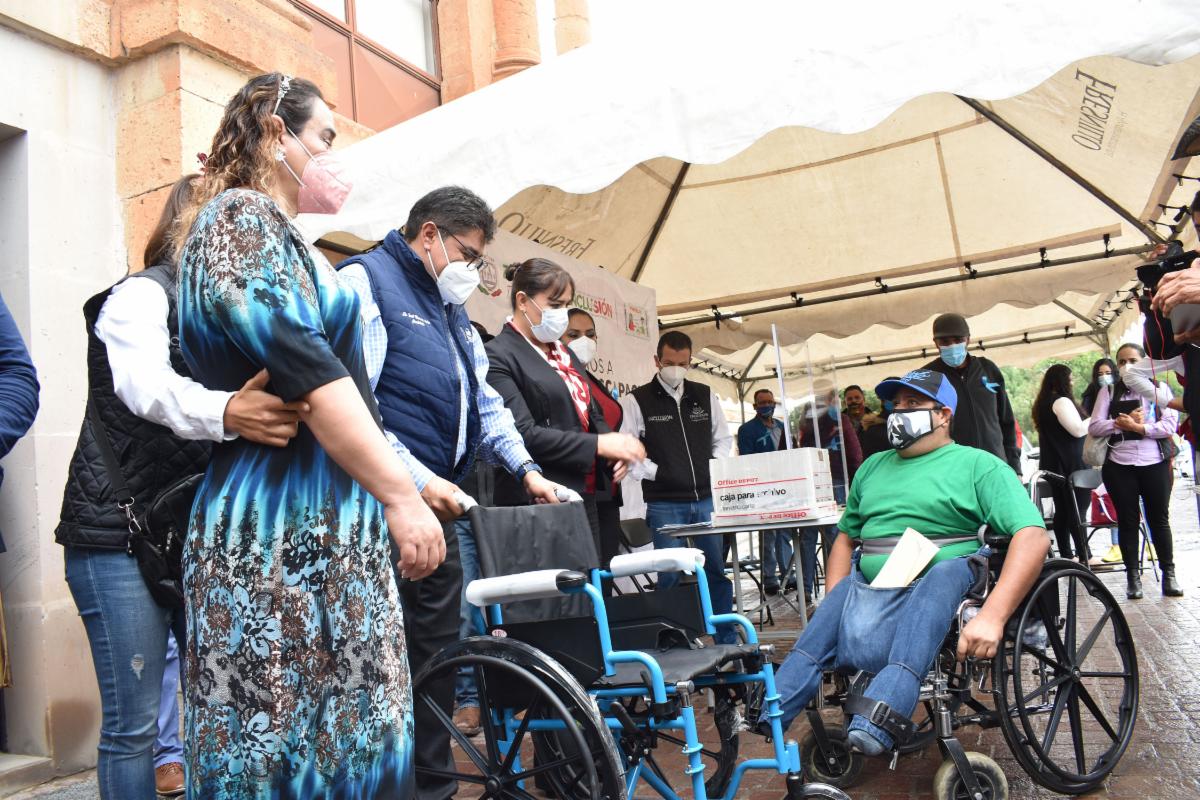 Fresnillo, Zac.- El Gobierno del Estado entregó 150 apoyos funcionales a personas con discapacidad de este municipio, entre ellos, sillas de ruedas infantiles y para adulto; bastones, andaderas, bastones para personas con discapacidad visual y muletas.