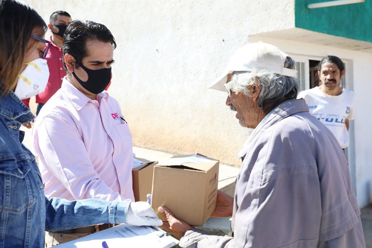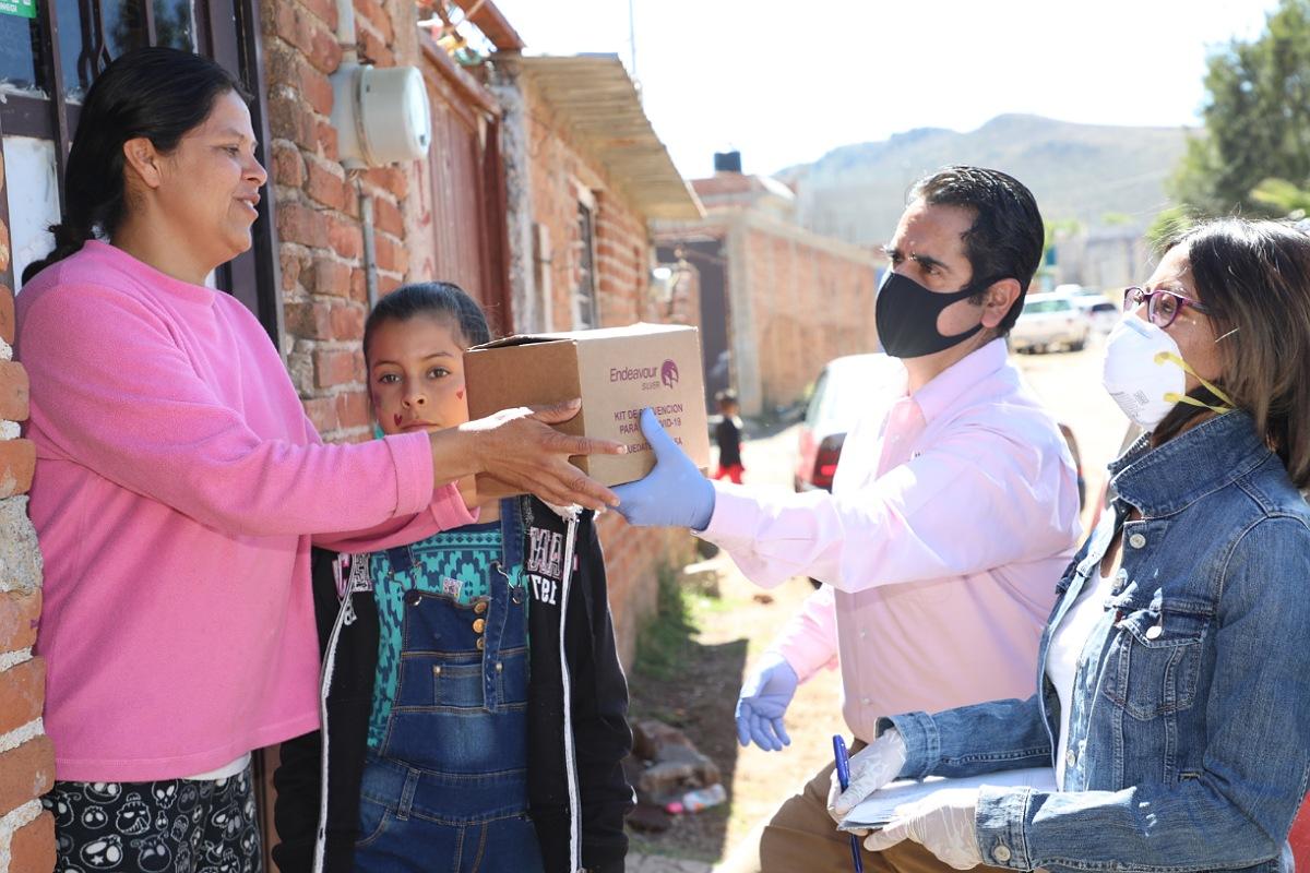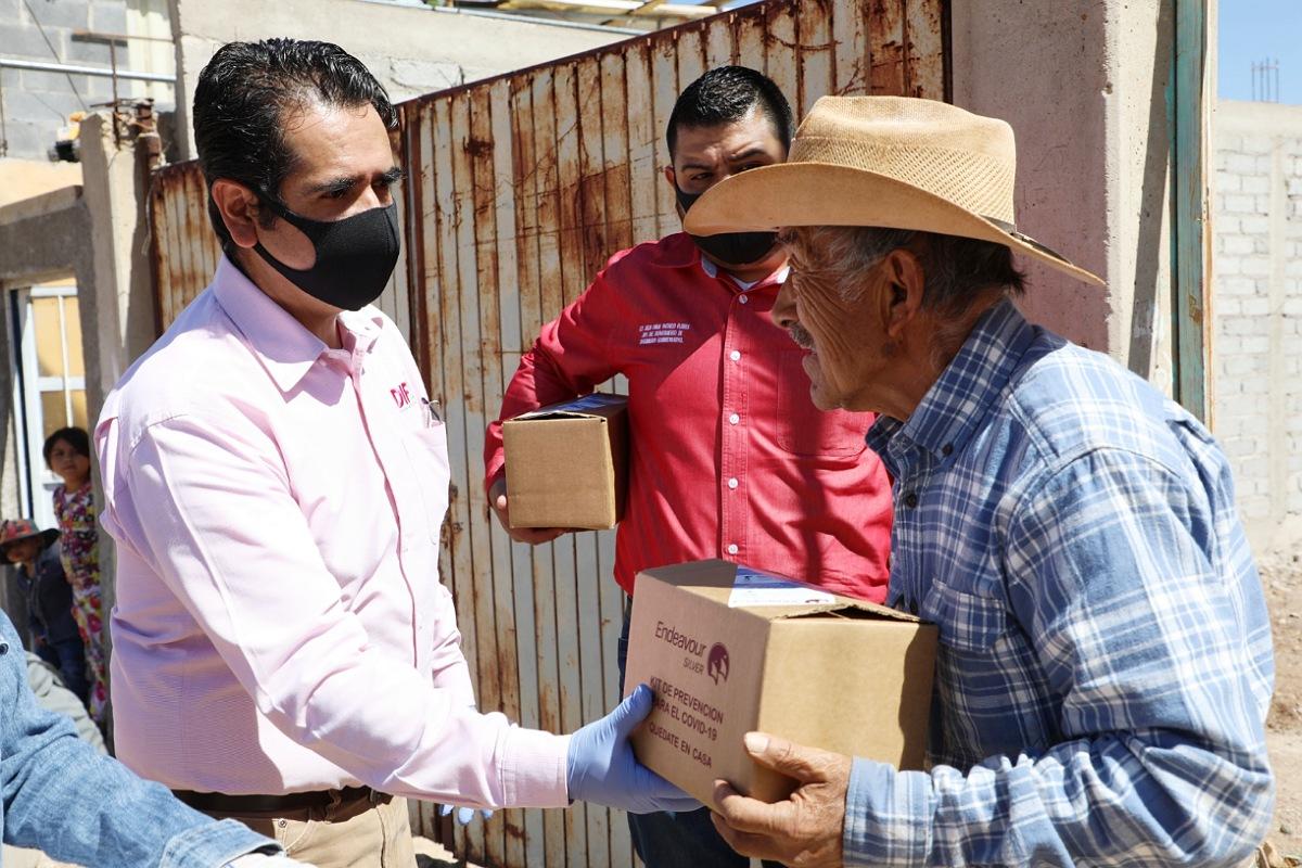 El Director General del SEDIF, Omar Acuña Ávila, con la representación del Gobernador Alejandro Tello y la Presidenta del organismo social, Cristina Rodríguez de Tello, encabezó la entrega, casa por casa, de 150 paquetes con gel antibacterial, cubrebocas, termómetro, guantes y algunos desinfectantes para el hogar.