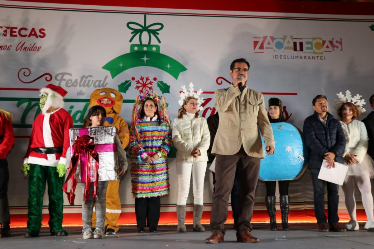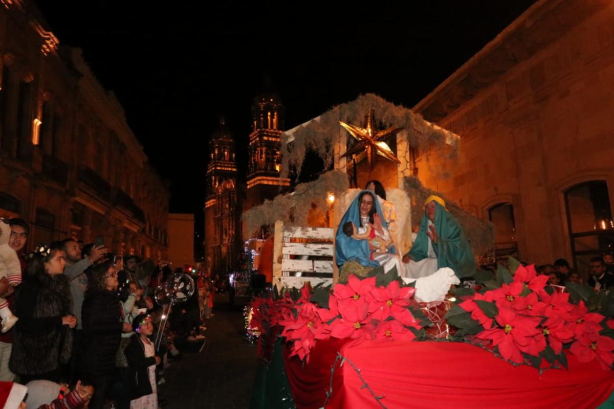 Zacatecas, Zac.- Miles de personas que se dieron cita al centro histórico de la capital disfrutaron del espectacular desfile navideño, en su edición 2019, en el que participaron 17 carros alegóricos, la Banda Sinfónica del Estado y varios contingentes de personajes navideños.