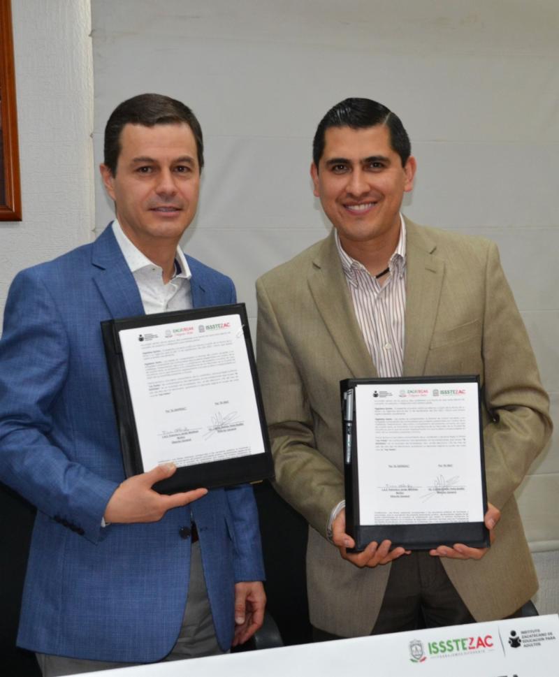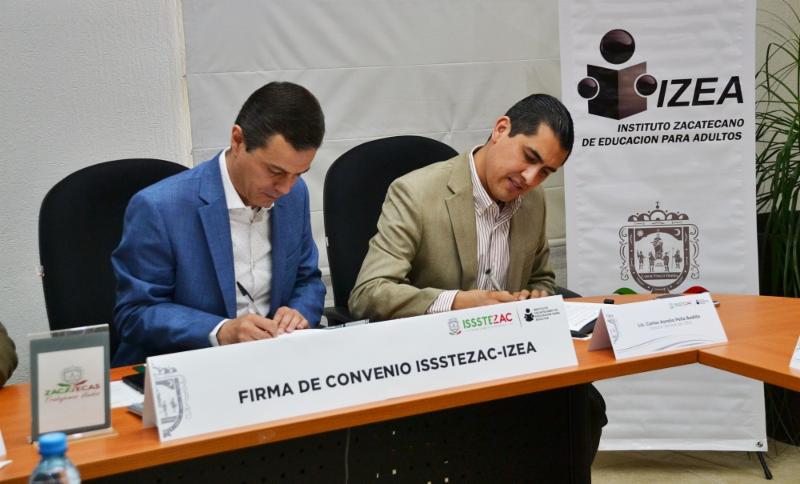Zacatecas, Zac.- Los directores generales de los institutos Zacatecano para la Educación de los Adultos (IZEA) y de Seguridad y Servicios Sociales de los Trabajadores del Estado (Issstezac), Carlos Peña Badillo y Francisco Javier Martínez Muñoz, respectivamente, firmaron un convenio para abatir el rezago educativo entre el personal de esta última instancia.