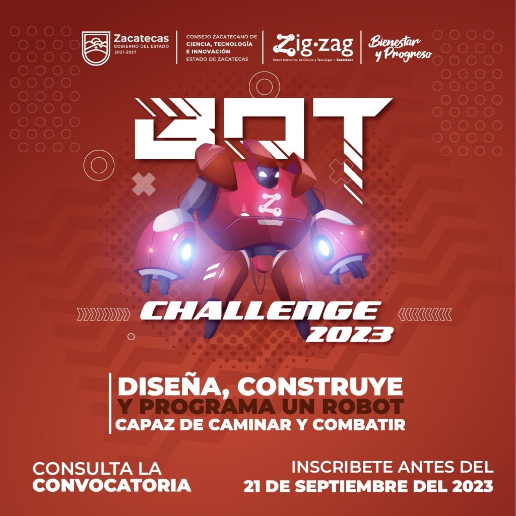 Zacatecas, Zac., 6 de septiembre de 2023.- El Consejo Zacatecano de Ciencia, Tecnología e innovación (Cozcyt) promueve entre la juventud el aprendizaje y la pasión por la robótica, motivo por el cual, invita a las instituciones de educación media superior y superior a participar en la Convocatoria de Bot Challenge 2023, organizada por el Centro Interactivo de Ciencia y Tecnología de Zacatecas Zigzag.