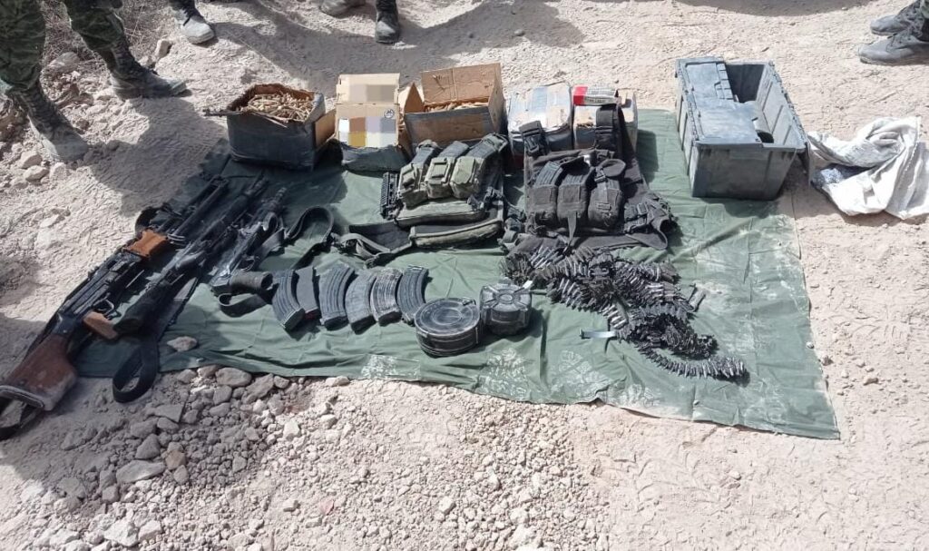 También, se aseguraron cuatro armas largas, 39 cargadores, 4 mil 602 cartuchos, 11 artefactos explosivos artesanales y dos granadas, así como siete vehículos, dos cuatrimotos, un remolque, nueve cintas de eslabones, tres chalecos tácticos y 500 gramos de probable marihuana.