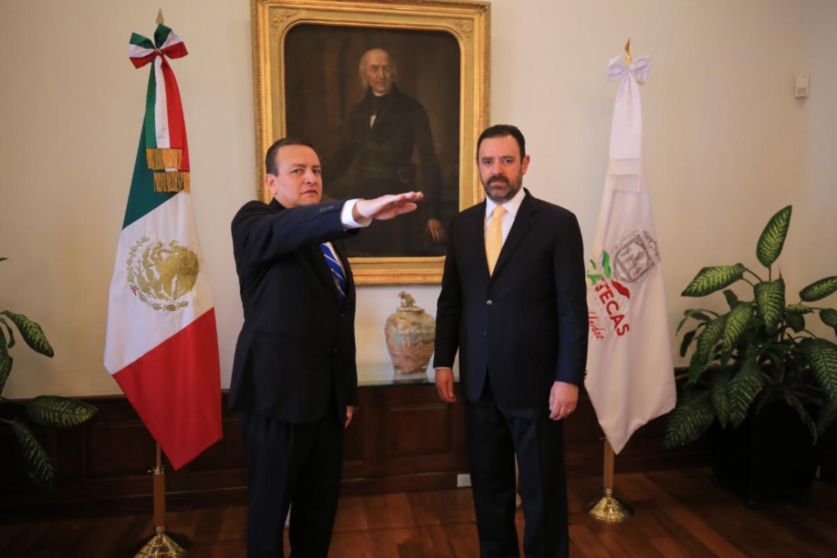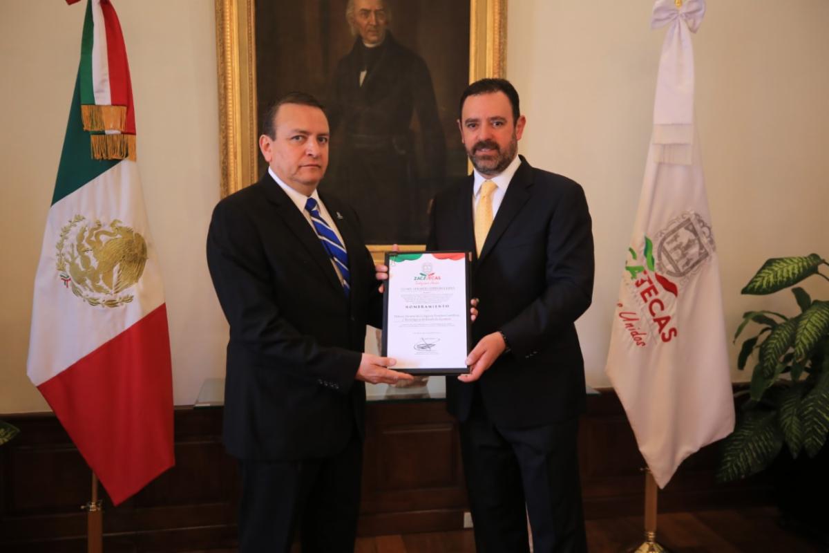 Zacatecas, Zac.- El Gobernador Alejandro Tello tomó protesta a Sergio Díaz de la Torre como rector de la Universidad Politécnica de Zacatecas (UPZ), Campus Fresnillo, y a Leonel Gerardo Cordero Lerma como Director de los Colegios de Estudios Científicos y Tecnológicos del Estado (CECYTEZ).