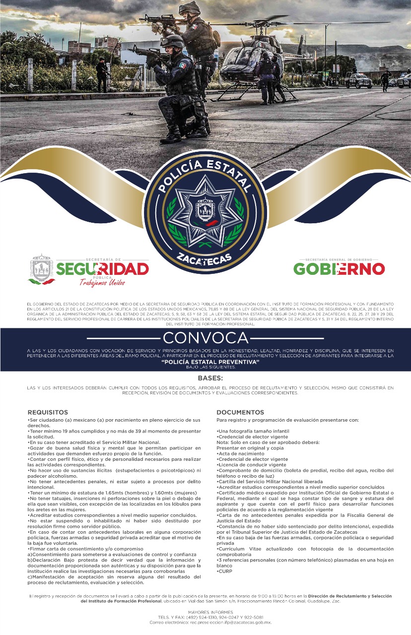 Zacatecas Zac.- El Gobierno del Estado, a través de la Secretaría de Seguridad Pública (SSP) y el Instituto de Formación Profesional (IFP), lanzó la convocatoria para unirse a las filas de la Policía Estatal Preventiva (PEP).