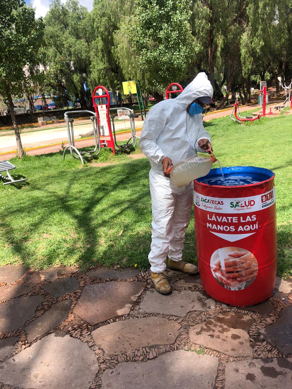 Zacatecas, Zac.- Con el objetivo de reforzar acciones para prevenir la propagación del COVID-19, la Secretaría de Obras Públicas (SOP) del Gobierno del Estado realiza trabajos de limpieza y desinfección en espacio públicos de la zona conurbada de Guadalupe-Zacatecas.