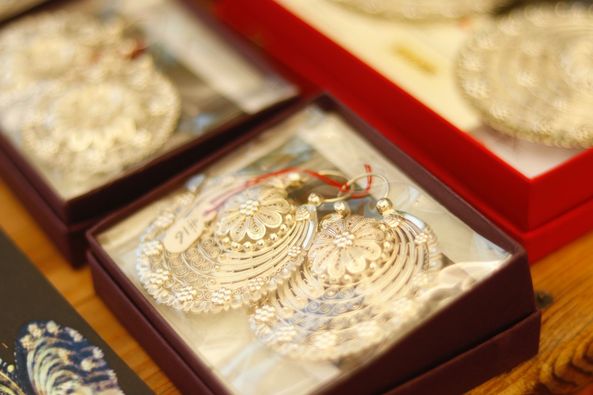 En cuatro stands exhiben hermosas piezas de plata, con varios diseños, tanto en aretes como gargantillas, dijes, pulseras, entre muchas otras que son tradicionales, pero principalmente y en variedad de tamaños, la tradicional arracada jerezana.