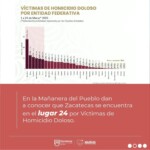 Por la mañana, en la conferencia de la Presidenta Claudia Sheinbaum, el Secretariado Ejecutivo del Sistema Nacional de Seguridad Pública dio cuenta que, entre el 1 y el 24 de marzo, Zacatecas registró 11 víctimas de homicidio doloso, ubicándose en el lugar 24 en ese delito, y que se coloca el lugar nueve de los estados más seguros del país, con el 0.7 por ciento del total nacional en este delito, muy por debajo del promedio nacional, que es de 50.6.
