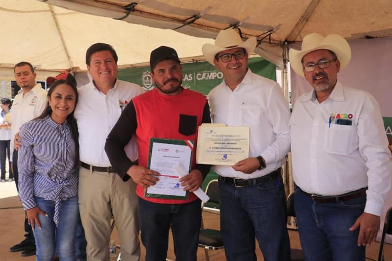En gira de trabajo el Secretario del Campo, Adolfo Bonilla Gómez, acompañado por el alcalde Alan Murillo, entregaron la primera etapa de los 12 millones de apoyos en maquinaria, equipos e insumos para el campo, en beneficio de más de 700 productores de las 173 comunidades de Sombrerete.