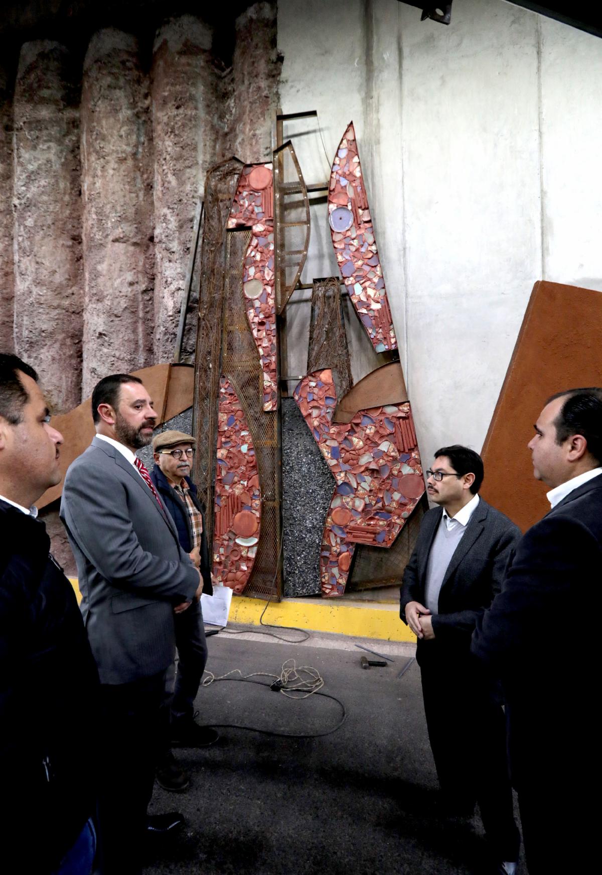 Zacatecas, Zac.- El artista plástico Alfonso López Monreal recibió al Gobernador Alejandro Tello con el fin de presentarle el comienzo de la instalación de su nuevo mural «Arroyo Pétreo», que se encontrará sobre el paso a desnivel de la Avenida Pedro Coronel, en el cruce con Avenida México.