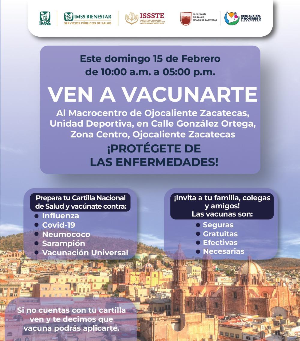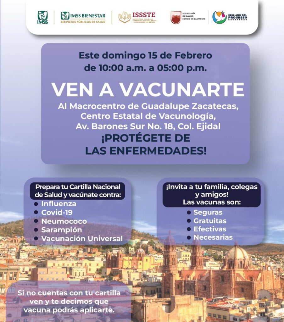 Zacatecas, Zac., 13 de febrero de 2026.- Como parte de la Agenda del Progreso y con el propósito de que la totalidad de las zacatecanas y zacatecanos completen su esquema de vacunación, la administración estatal, encabezada por el Gobernador David Monreal Ávila, por medio de la Secretaría de Salud (SSZ), lleva a cabo una estrategia, a través de la cual se instalarán tres macrocentros, este domingo 15 de febrero, en los municipios de Guadalupe, Fresnillo y Ojocaliente.