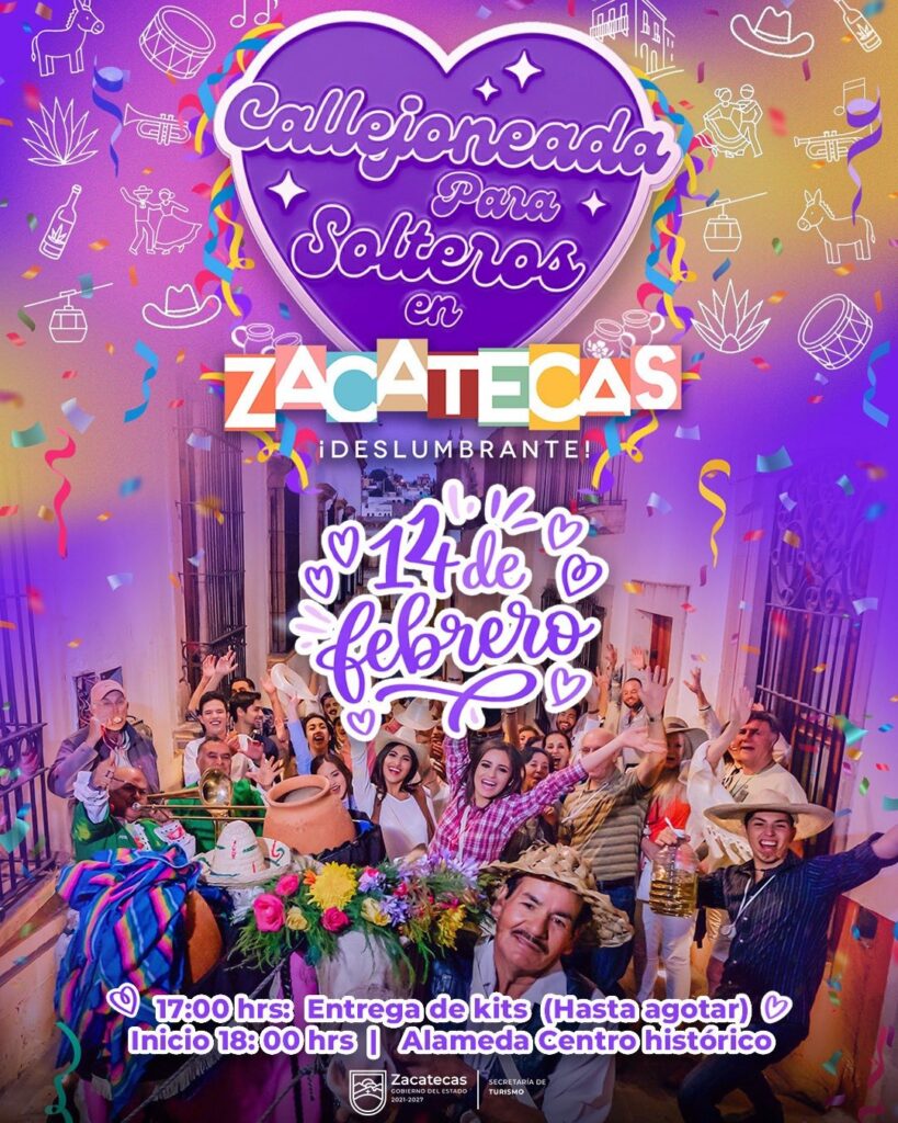Zacatecas, Zac., 12 de febrero de 2026.- Como parte de las estrategias de promoción turística que impulsa el Gobernador David Monreal Ávila, a través de la Secretaría de Turismo (Secturz), este fin de semana tendrá lugar la Callejoneada para Solteros, Segunda Edición, en el marco de las actividades conmemorativas del Día del Amor y la Amistad.