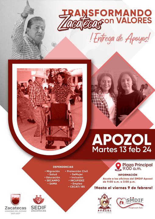 Con el objetivo de fortalecer a las familias Zacatecanas y a los grupos de atención prioritaria, conformados por adultos mayores, personas con discapacidad, infancias y personas en situación de abandono, el Gobierno del Estado, que encabeza el Lic. David Monreal Avila, a través del SEDIF Zacatecas, a cargo de la Dra. Sara Hernández De Monreal, y en coordinación con el Gobierno Municipal de Apozol 2021-2024, que encabeza la edil Gabriela Arellano Quezada, ofertará en el municipio el programa denominado «Transformando Zacatecas con Valores» el próximo martes 13 de febrero a las 9:00 am en la Plaza Principal.